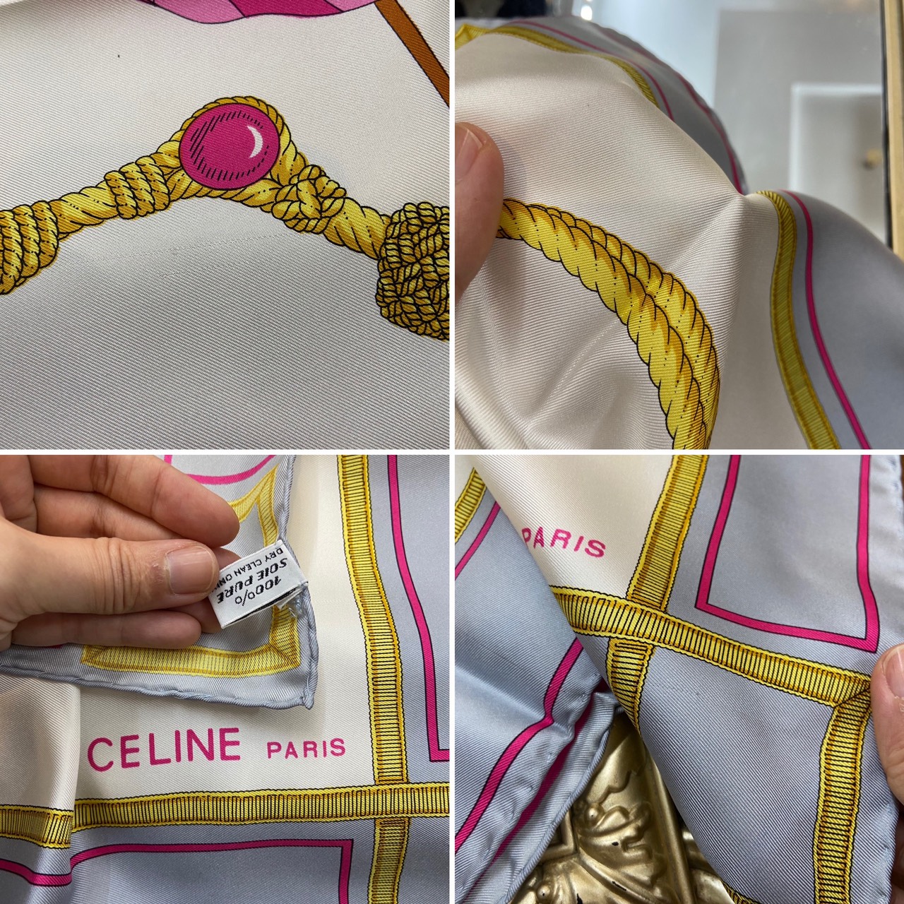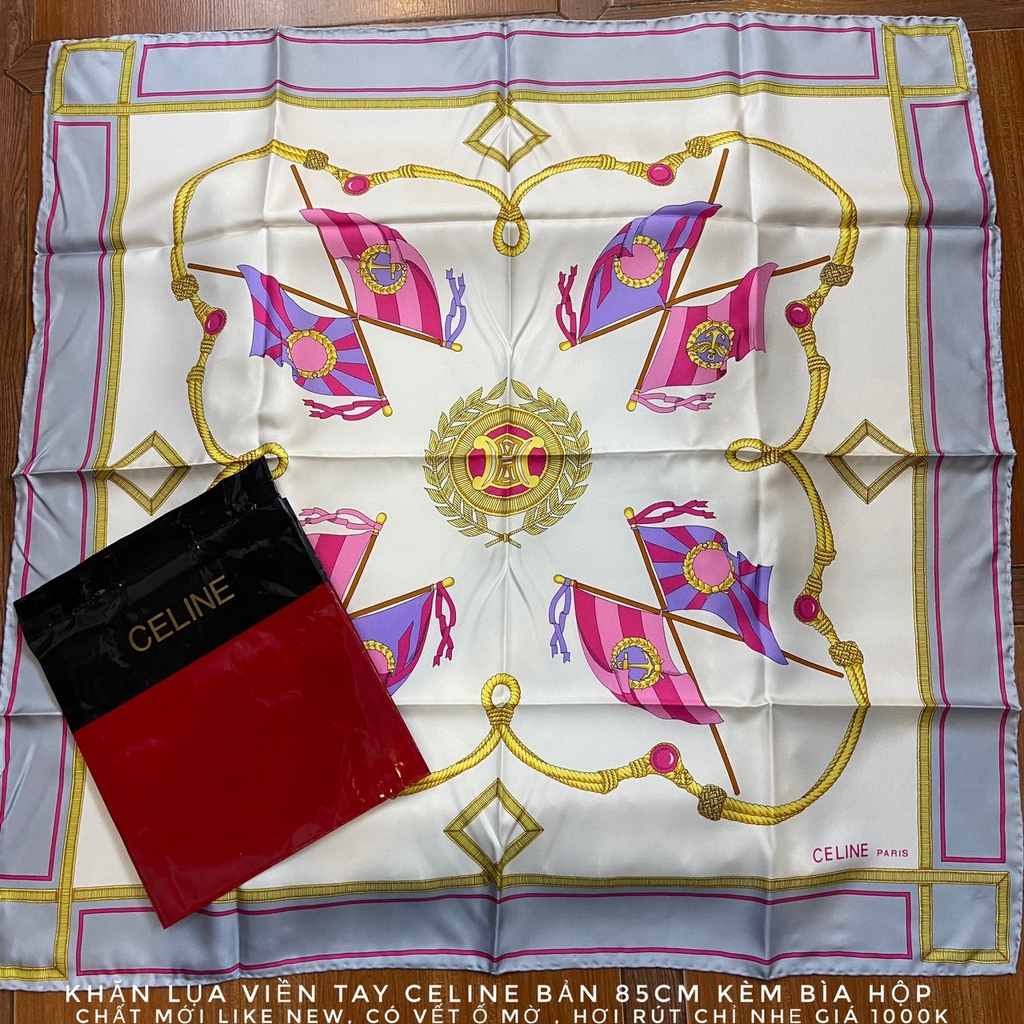 Khăn lụa viền tay Celine bản 85cm kèm bìa hộp chất mới like new, có vết ố mờ, hơi rút chỉ nhẹ
