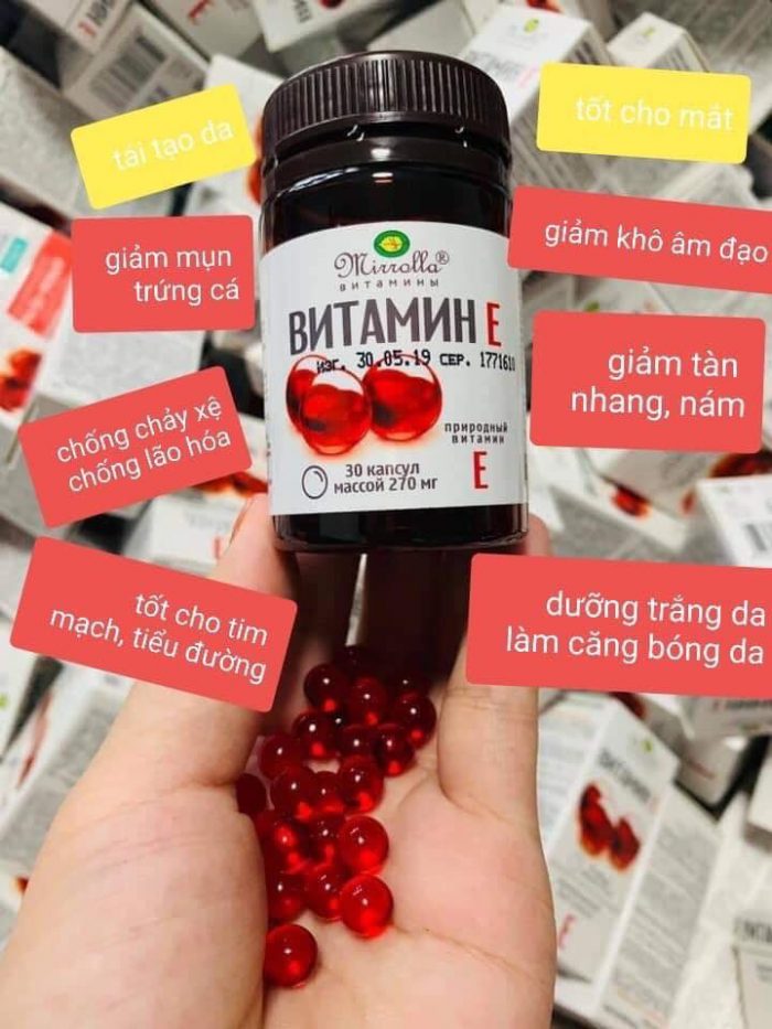- Ngoài việc bổ sung vitamin E từ các nguồn tự nhiên như thực phẩm, đồ uống hàng ngày, một cách nữa cũng thường xuyên được sử dụng để bổ sung vitamin E đầy đủ cho cơ thể mỗi ngày, đó là sử dụng các sản phẩm bổ sung vitamin E như Vitamin E mirrolla Nga.